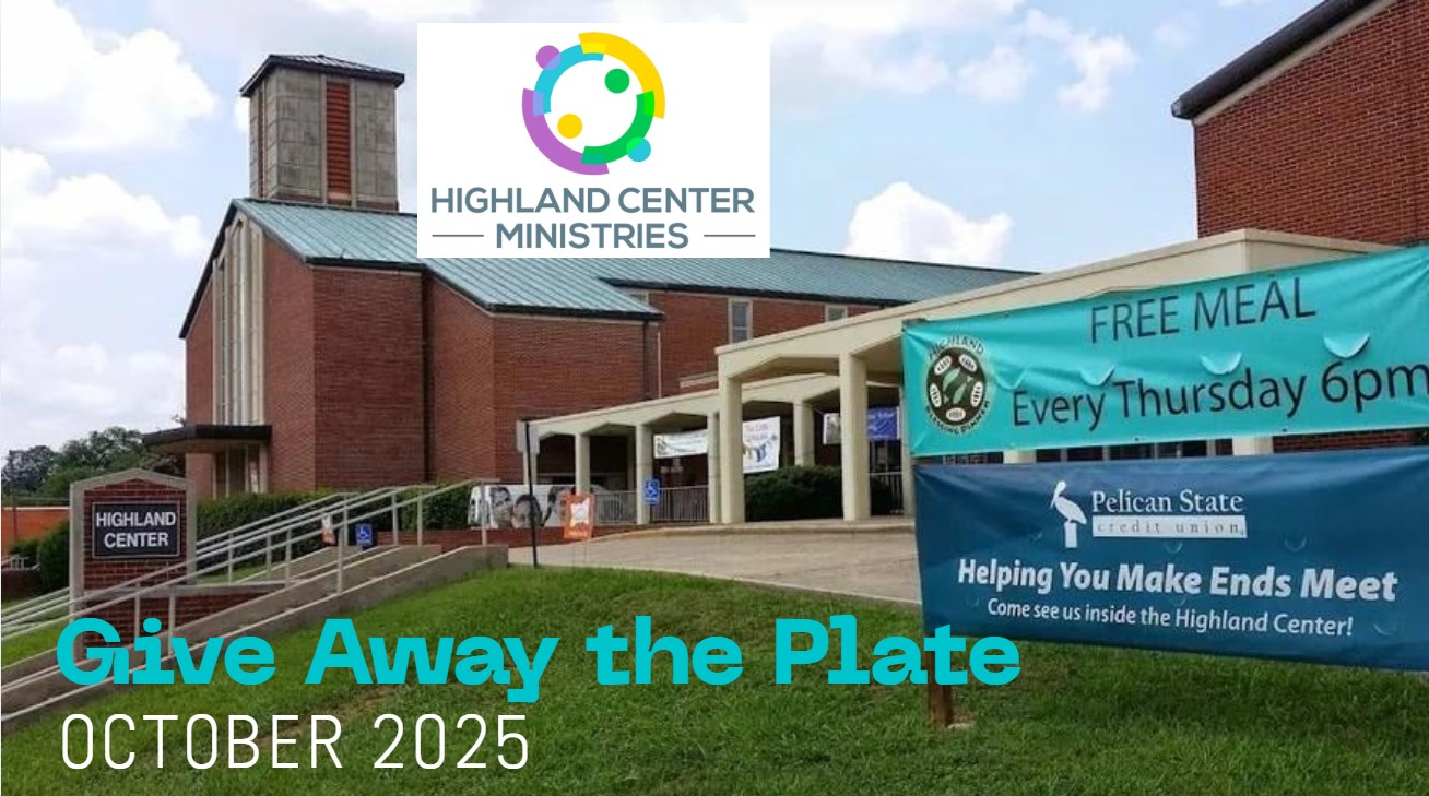 Online — Go to our donation site using this link. If you are paying your pledge, select “2025 Pledges” and enter that amount for your pledge contribution. Then select “Collection Plate” to give the amount you would like to give to North Louisiana Interfaith and then put “GATP OCT 2025” or “Highland Center Ministries” in the comment section. All online collection plate contributions for the month of October 2025 will go to Highland Center Ministries.