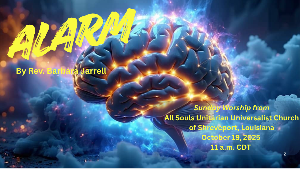 Please join us this Sunday (19 October 2025) at 11:00 AM for “Alarm” by Rev. Barbara Jarrell.