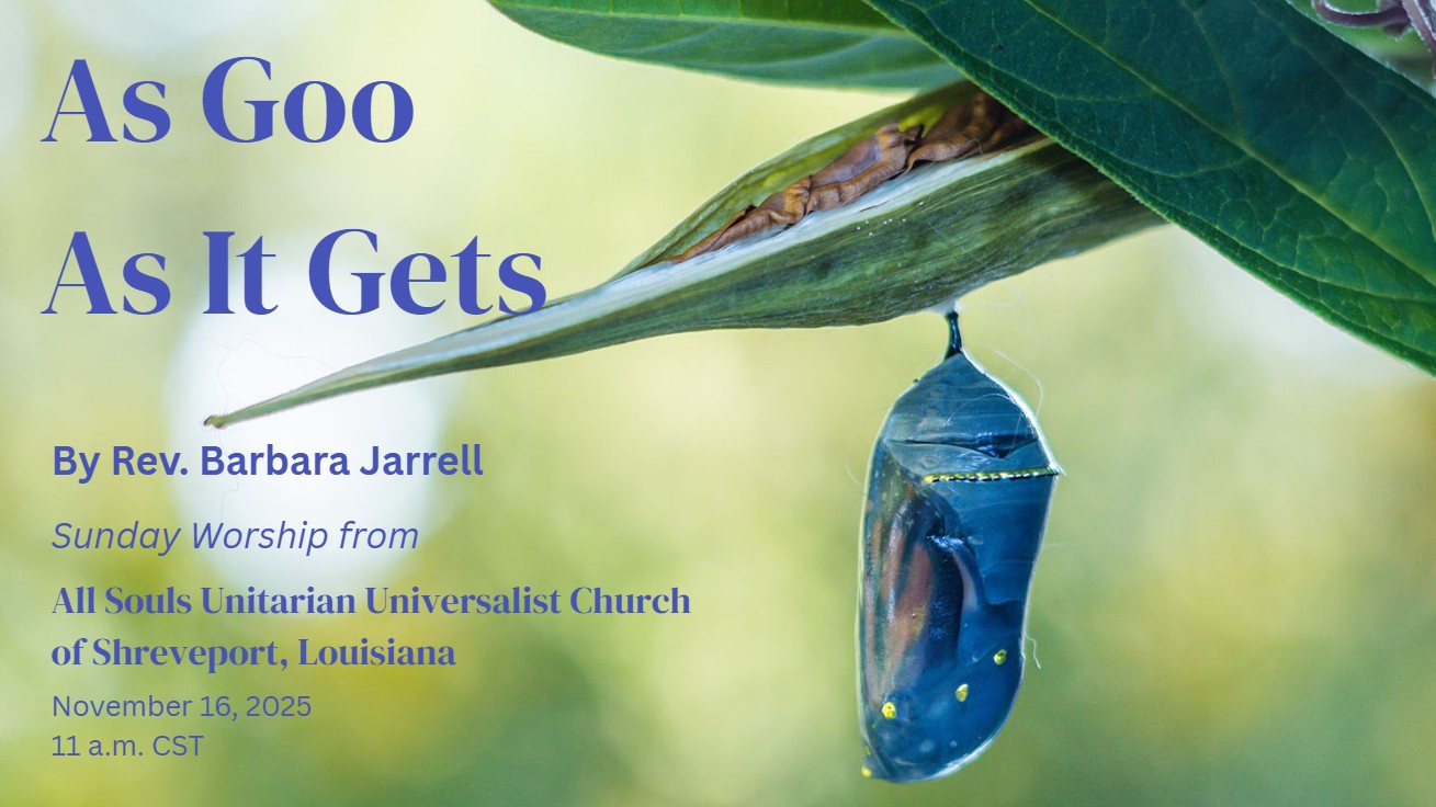 Please join us this Sunday (16 November 2025) at 11:00 AM for “As Goo As It Gets” by Rev. Barbara Jarrell.