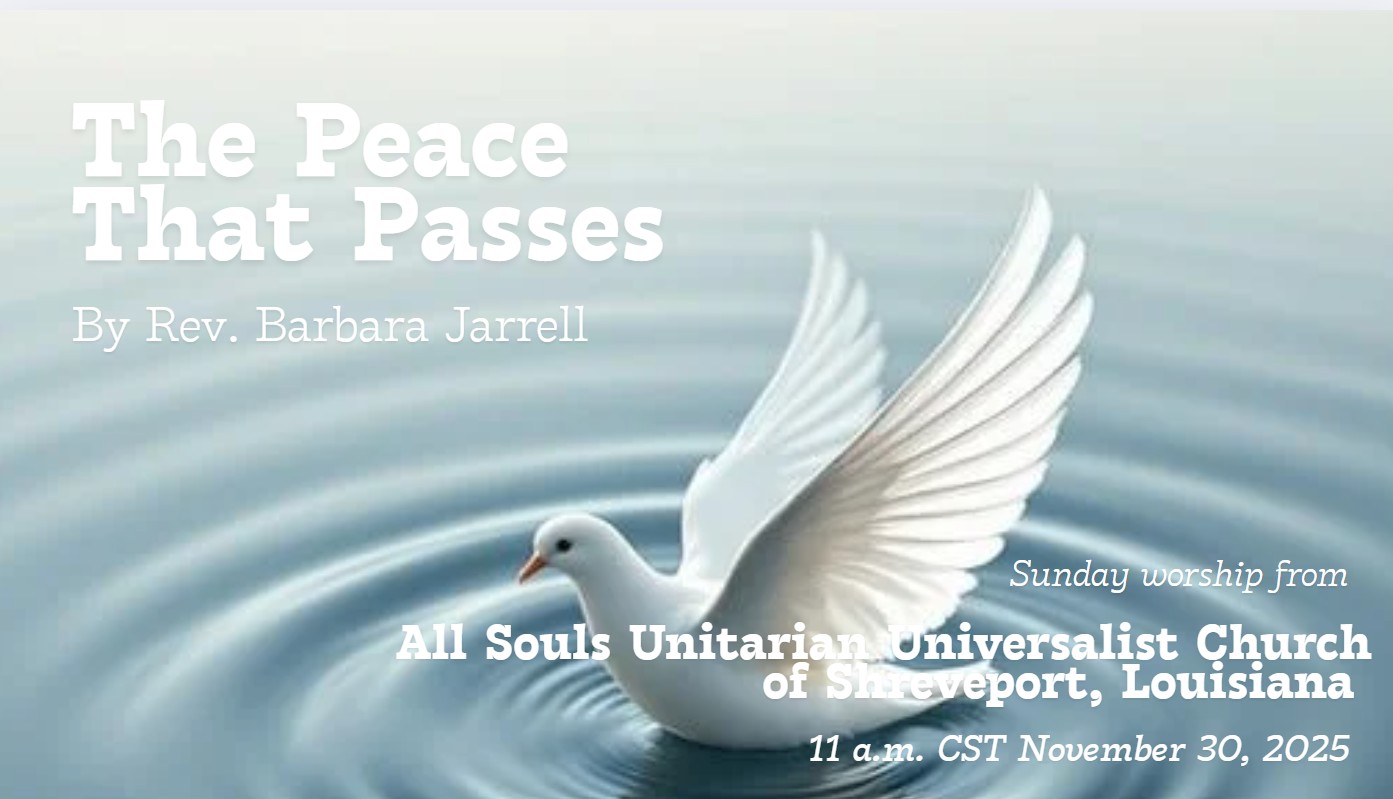 Please join us this Sunday (30 November 2025) at 11:00 AM for “The Peace That Passes” by Rev. Barbara Jarrell.