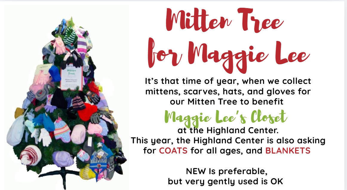 It’s that time of year again when we collect mittens, scarves, hats, and gloves for our mitten tree to benefit Maggie Lee’s Closet at the Highland Center.