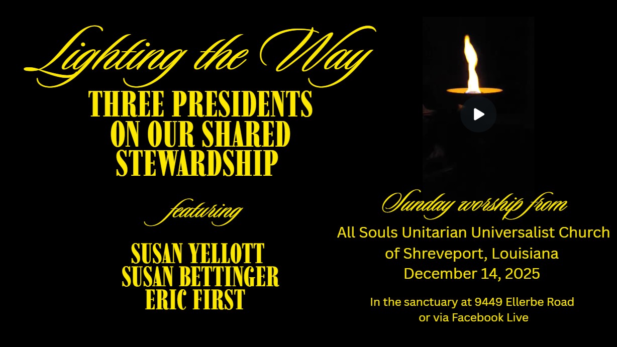 Generosity is one of our shared Unitarian Universalist values and on this Sunday our current President and two past All Souls Presidents to share with us the importance of supporting our church home to the extent that we can to with time, talent, and treasure.