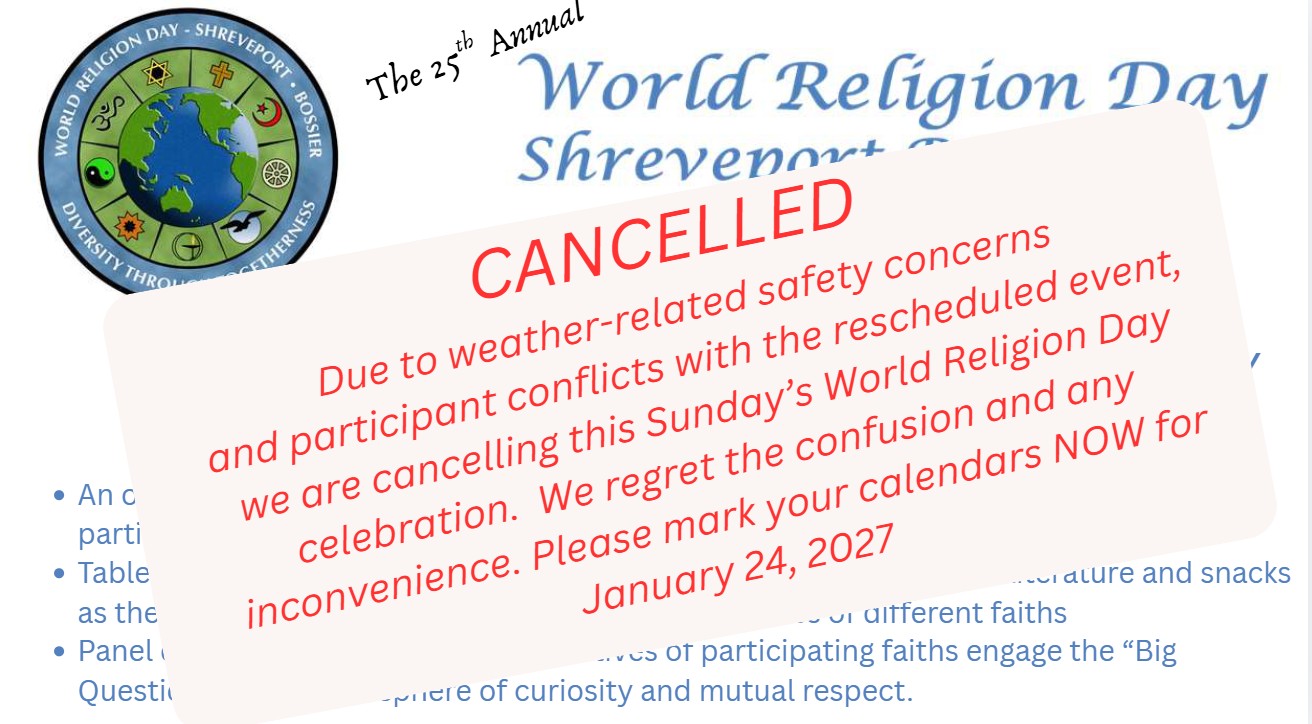 Due to weather-related safety concerns and participant conflicts with the rescheduled event date, we are cancelling this Sunday’s (1 February 2026) World Religion Day celebration.