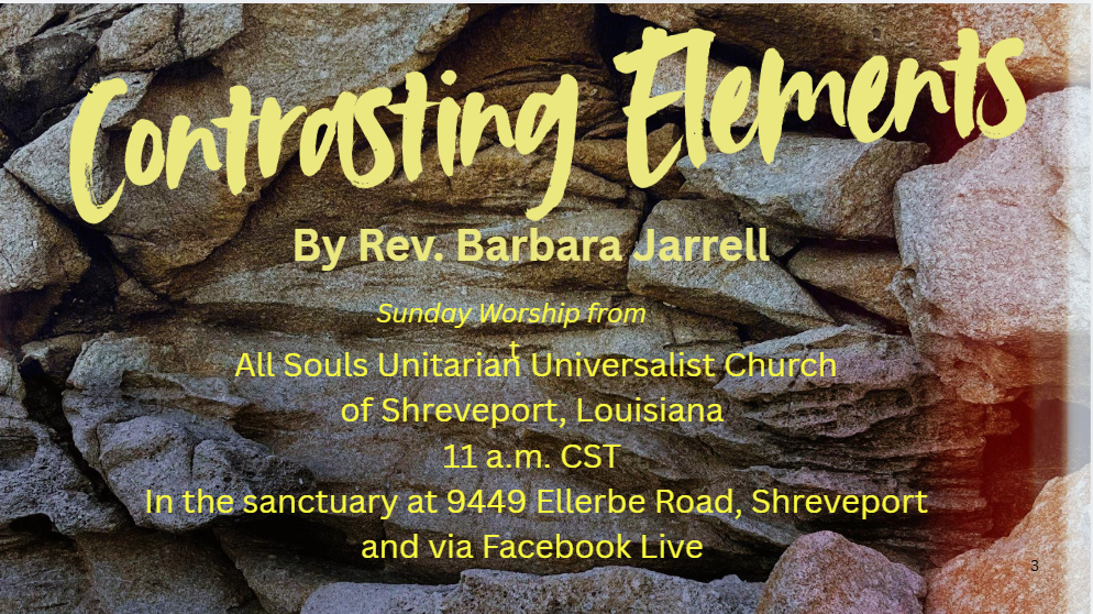 Please join us this Sunday (15 February 2026) at 11:00 AM for “Contrasting Elements” by Rev. Barbara Jarrell.