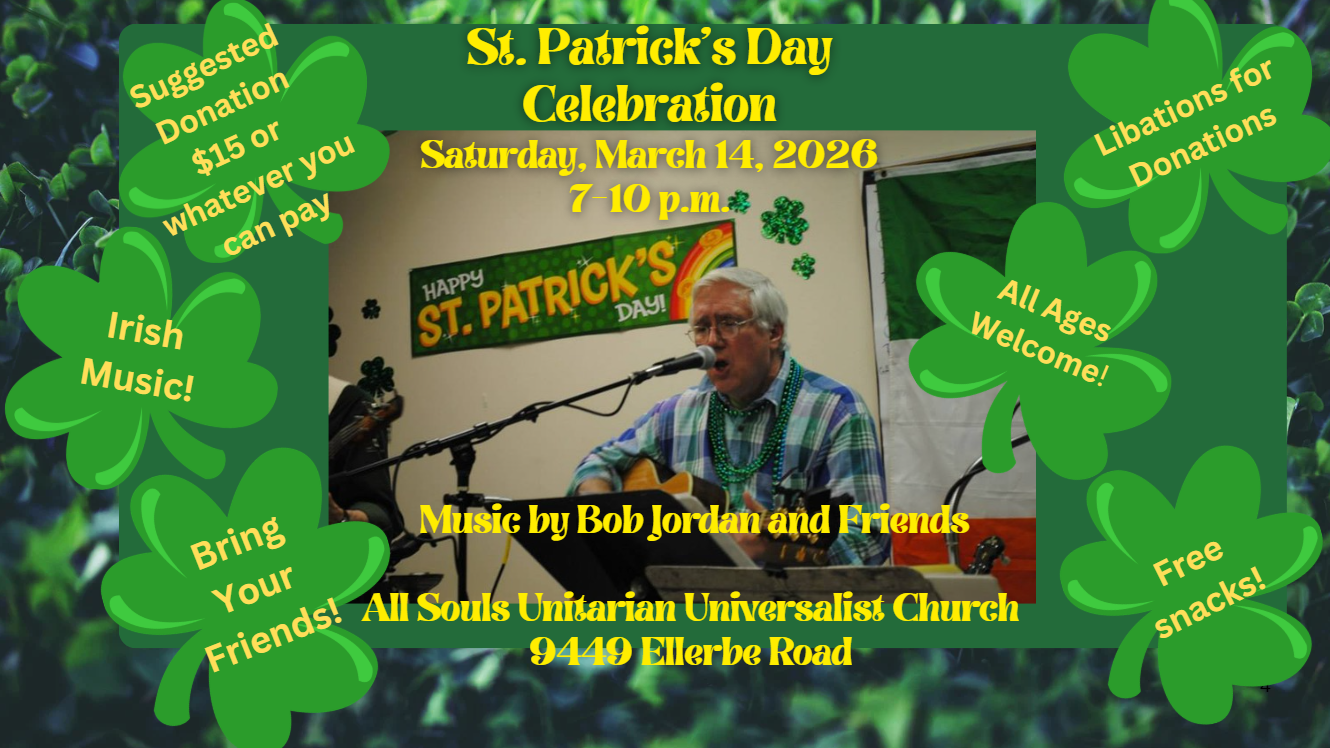 Join us as the social hall is transformed into an Irish pub — complete with Irish music by Bob Jordan and friends, free snacks, and libations for donations (including Guinness, Bailey’s with or without ice cream, and non-alcoholic drinks).