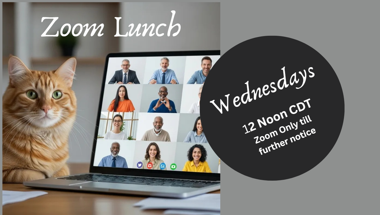 With the busy lives of our regular participants, our in-person Zoom lunches are on hold for the time being but the link is always open to join at noon every Wednesday.
