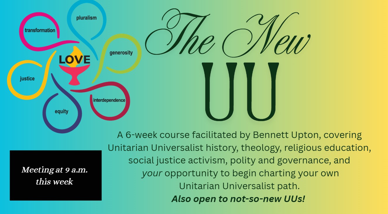 The New UU Class will resume this Sunday (12 April 2026) at 9:00 AM before the 11:00 AM worship service.