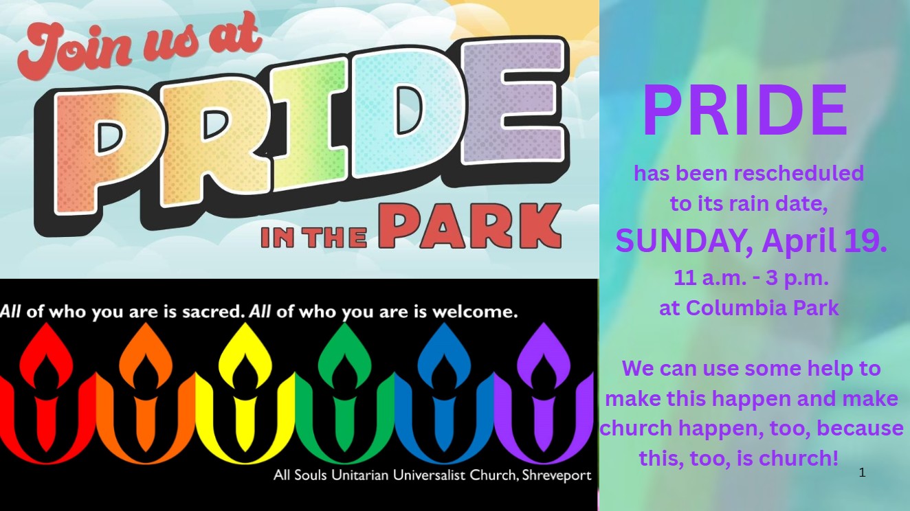 The 2026 Pride in the Park event (sponsored by PACE — People Acting for Change and Equality) has been rescheduled to Sunday (19 April 2026) from 11:00 AM to 3:00 PM due to forecast rain and thunderstorms on Saturday (18 April 2026).