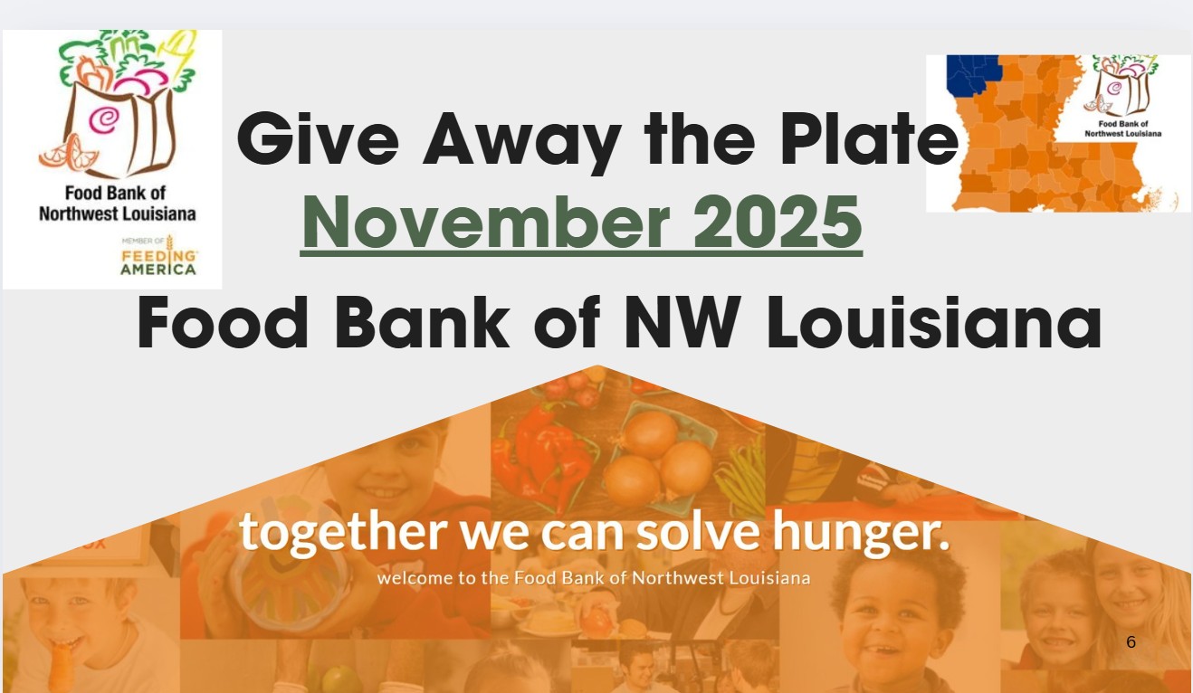 Our November 2025 give-away-the-plate recipient is the Food Bank of Northwest Louisiana.